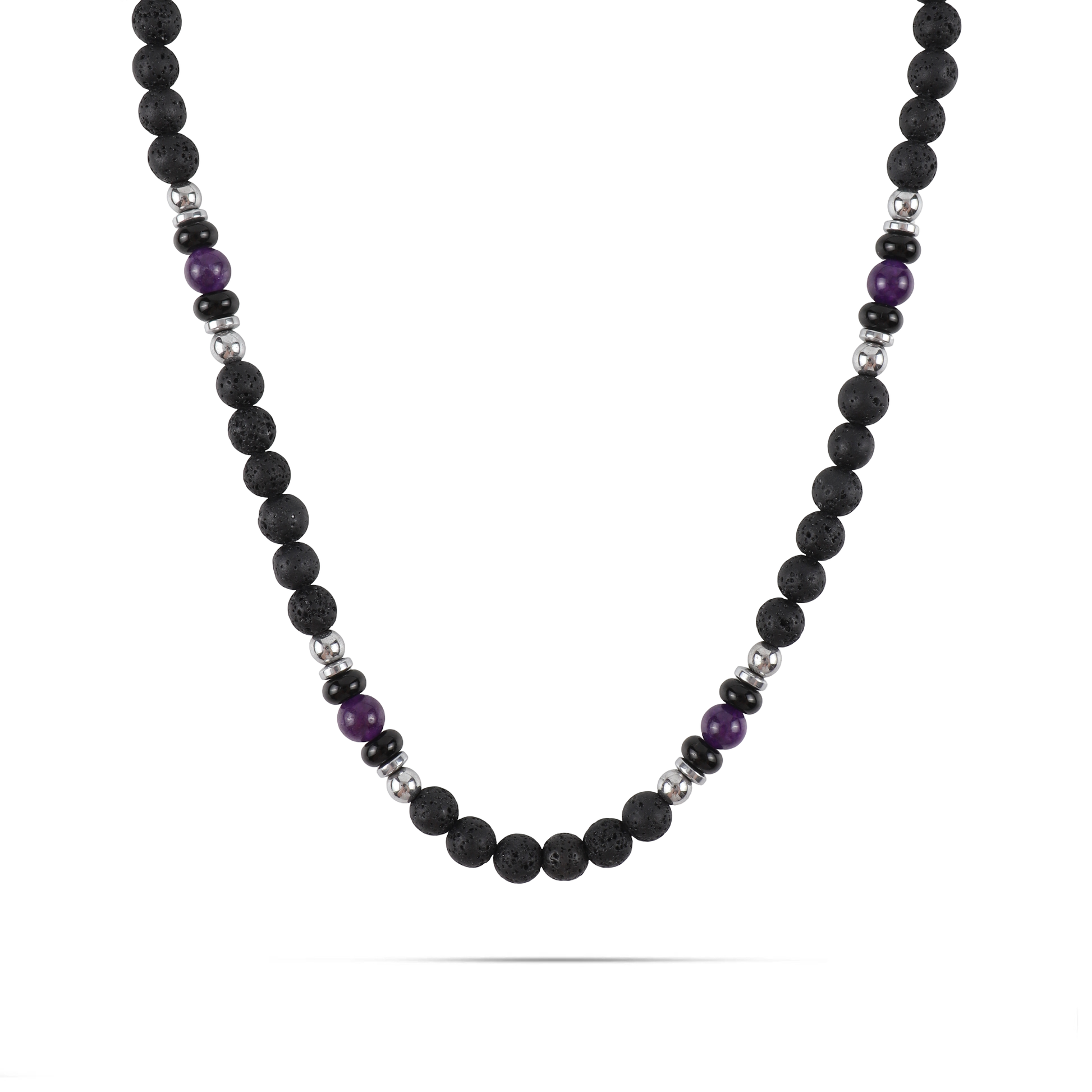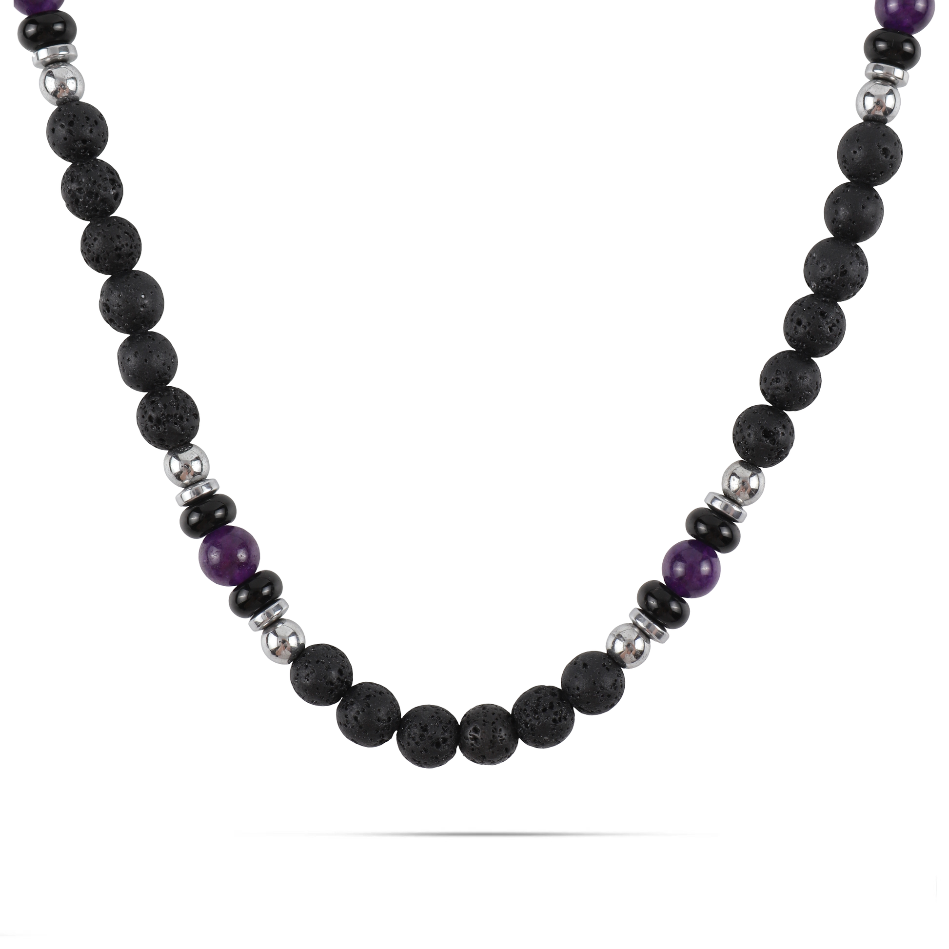 Ανδρικό χειροποίητο κολιέ με φυσικές ορυκτές πέτρες από λάβα (0,8cm), αμέθυστο (0,8cm), ασημί πλακέ ροδέλα αιματίτη (0,6cm), μαύρη ροδέλα αιματίτη (0,7cm) και ασημί μπίλια αιματίτη (0,6cm).