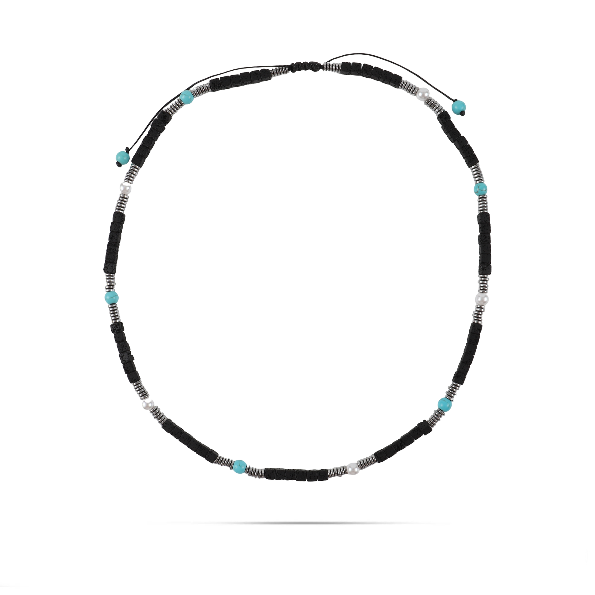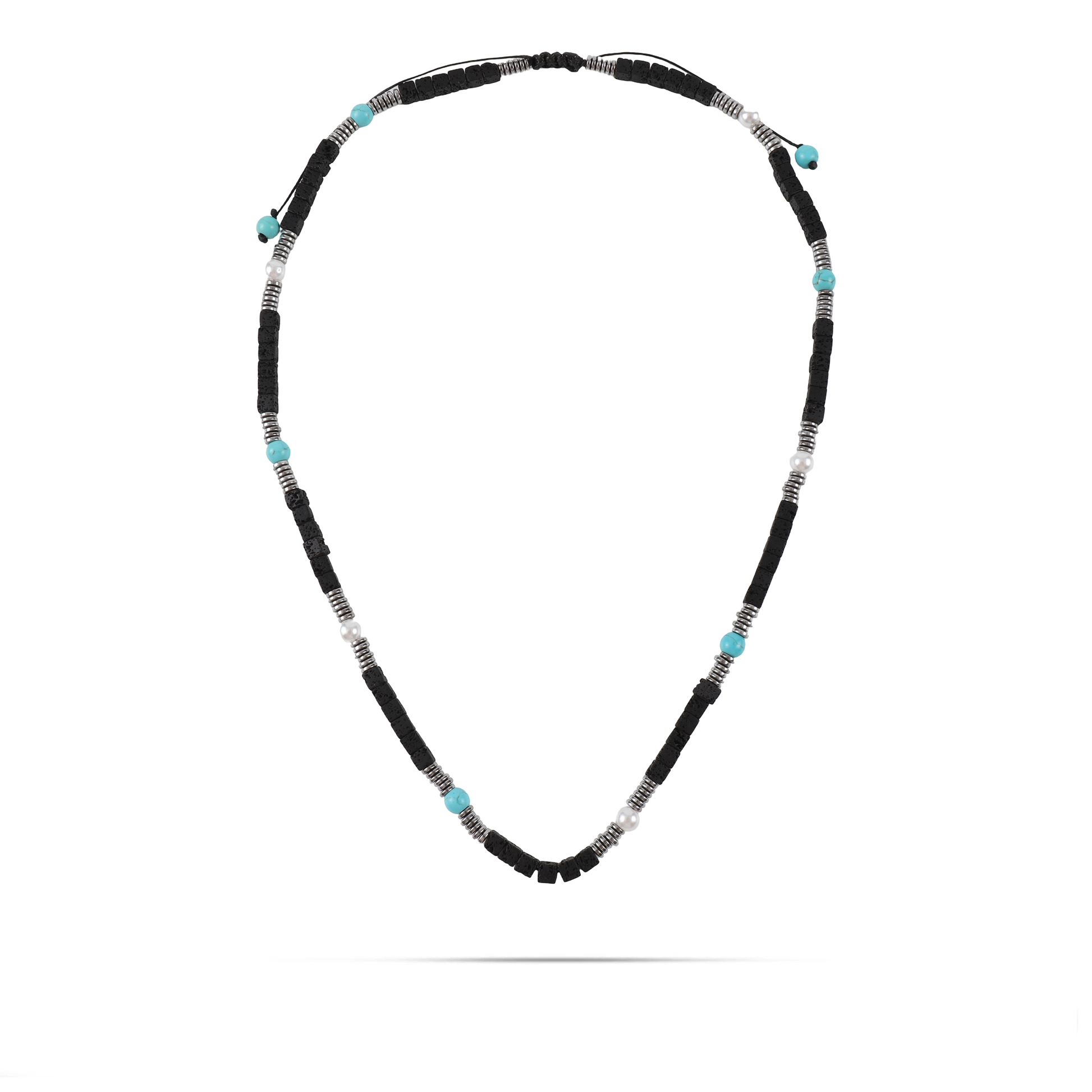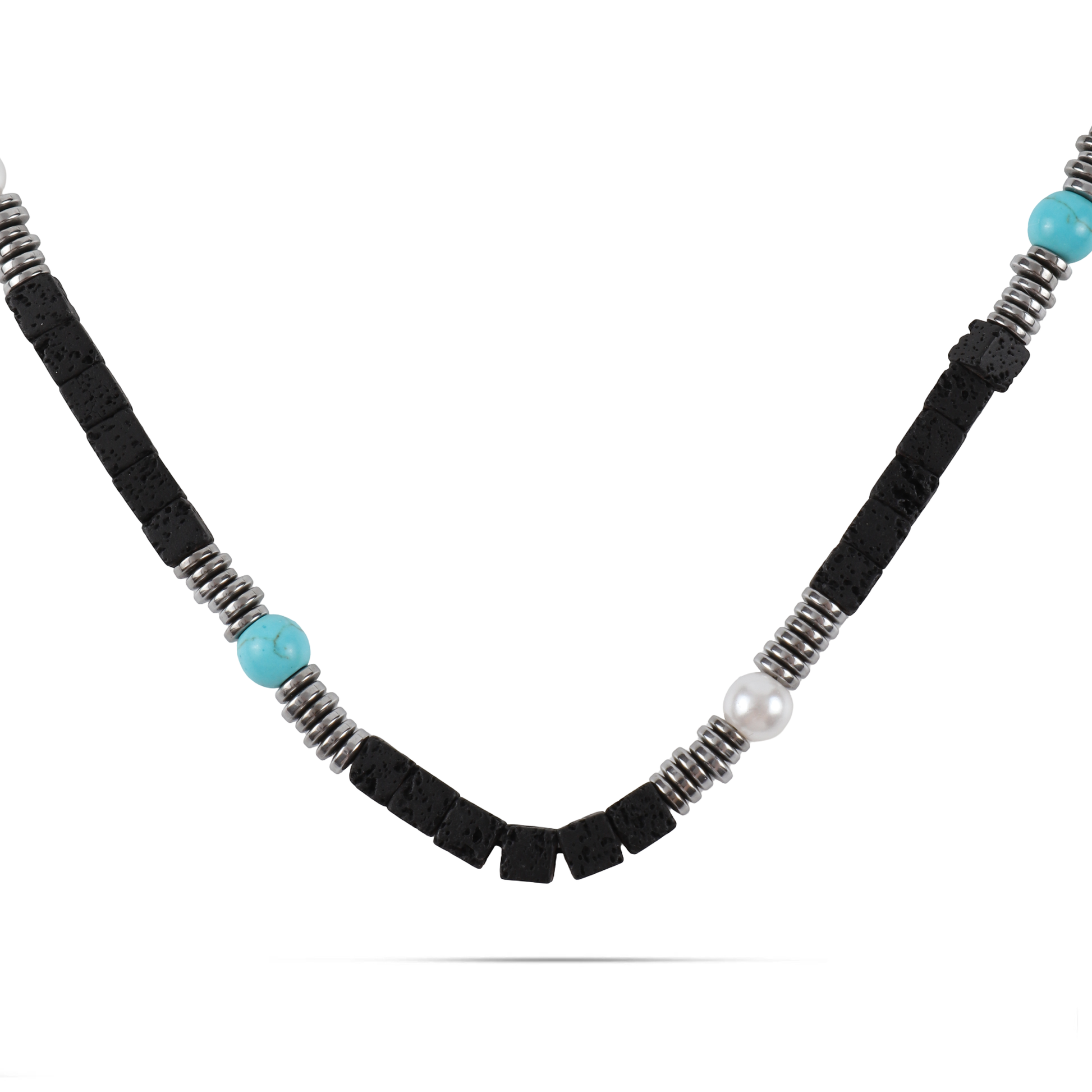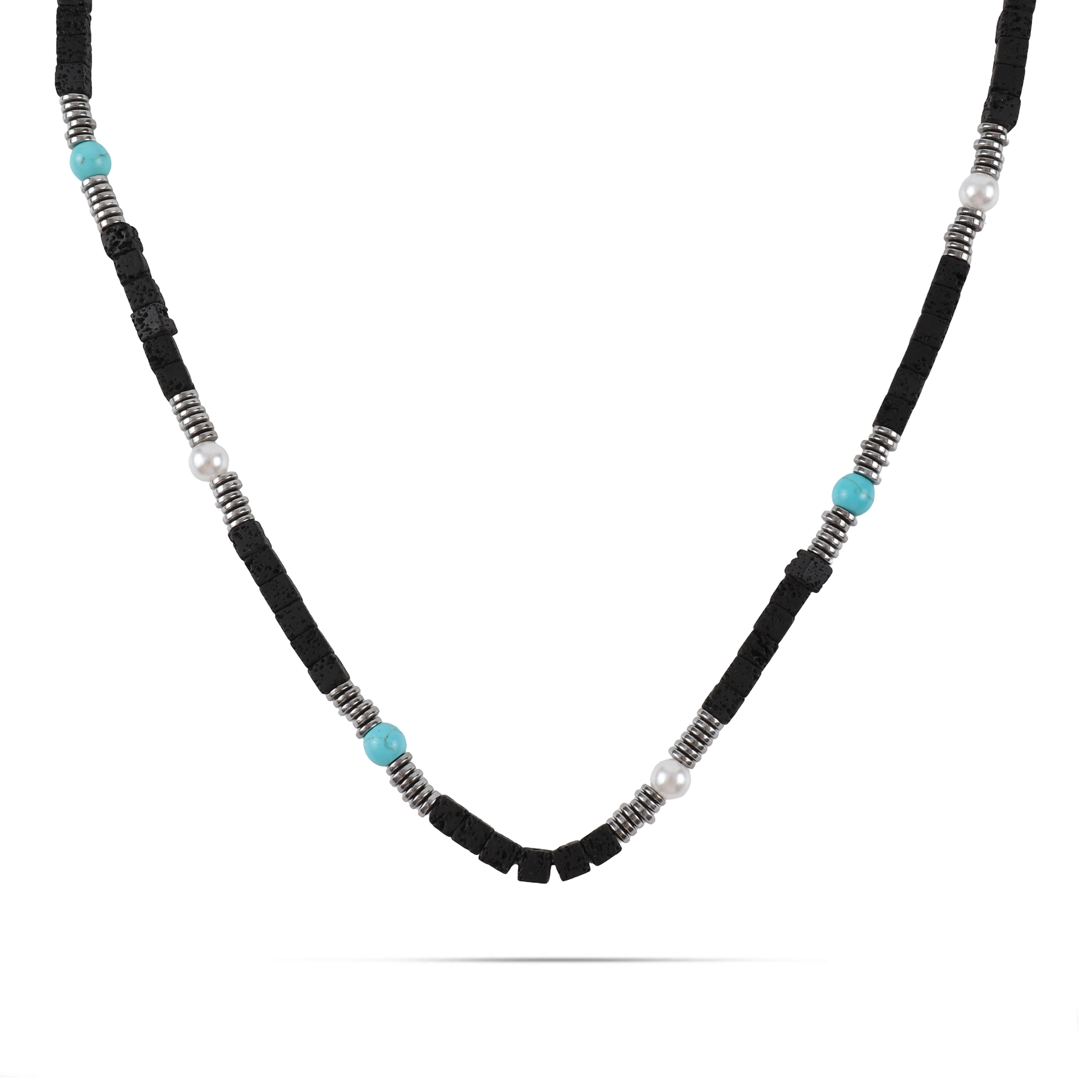 Ανδρικό χειροποίητο κολιέ με φυσικές ορυκτές πέτρες από τιρκουάζ χαολίτη (0,6cm), μαύρους κύβους λάβας (0.5cm), λευκό μαργαριτάρι νερού (0.6cm) και ασημί πλακέ ροδέλες αιματίτη (0.4cm).