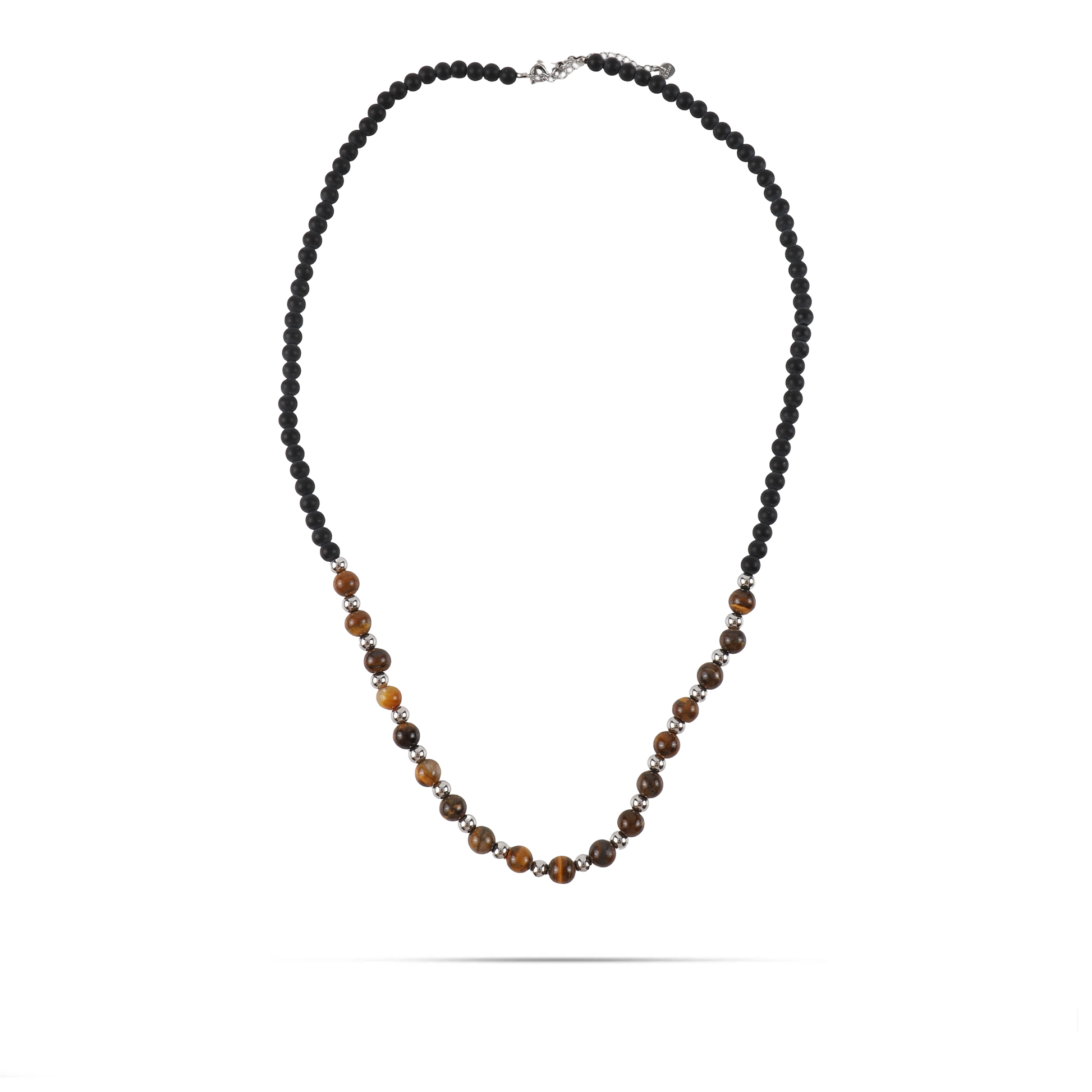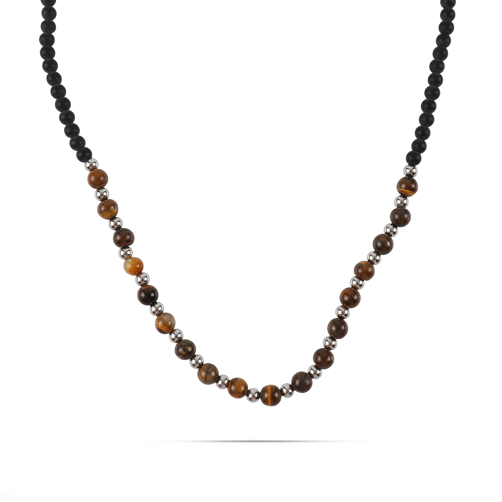 Ανδρικό χειροποίητο κολιέ με φυσικές ορυκτές πέτρες από μάτι τίγρης (0.8cm), όνυχα (0.6cm) και ασημί μπίλιες αιματίτη (0.6cm).