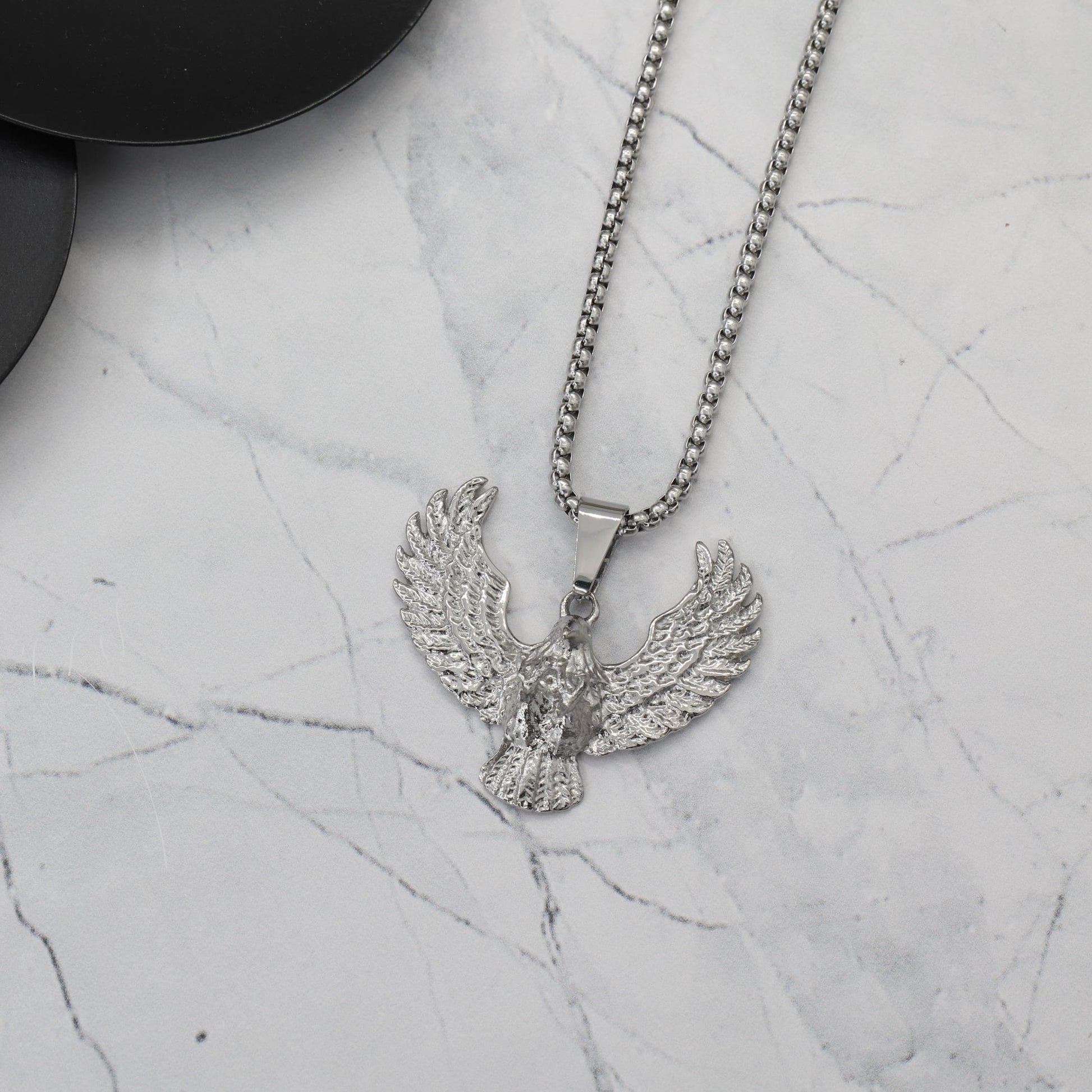 Κολιέ Eagle από ανοξείδωτο ατσάλι σε ασημί χρώμα, ένα ιδιαίτερο κόσμημα για τον λαιμό σας. Διαθέτει αλυσίδα και μενταγιόν σε σχήμα αετού, με τρία διαφορετικά σχέδια για να επιλέξετε αυτό που ταιριάζει καλύτερα στο προσωπικό σας στυλ. Ένα εκλεπτυσμένο και μοντέρνο κόσμημα που προσθέτει δυναμισμό και ξεχωριστή προσωπικότητα σε κάθε εμφάνιση, ιδανικό για καθημερινή χρήση ή για ιδιαίτερες περιστάσεις.