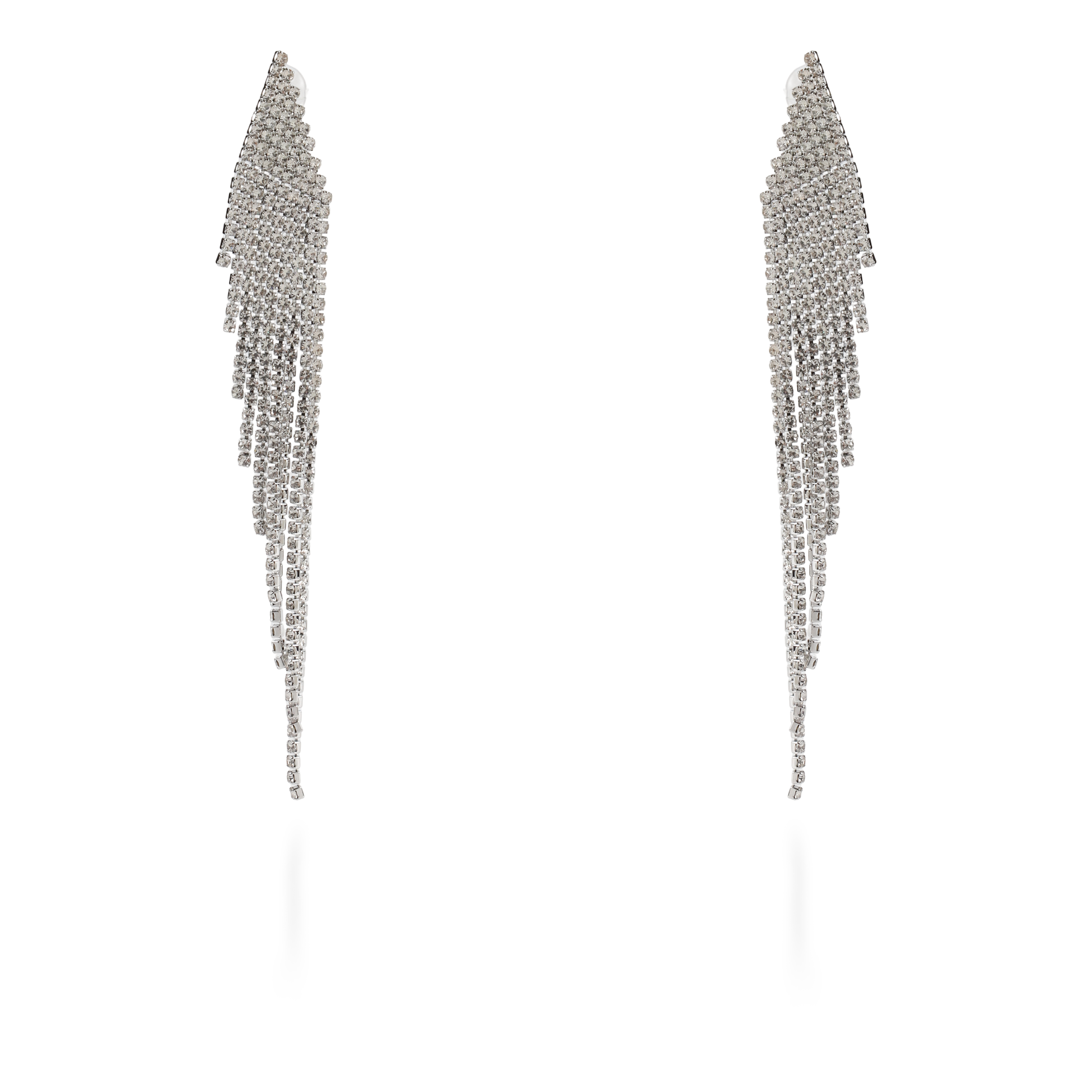 Σκουλαρίκια κρεμαστά από ορείχαλκο σε ασημί χρώμα διακοσμημένα με λαμπερές πέτρες Zircon μια κομψή και λαμπερή επιλογή για κάθε περίσταση.Αυτά τα σκουλαρίκια είναι ιδανικά για επίσημες και για ειδικές περιστάσεις, προσθέτοντας λάμψη και κομψότητα στο στυλ σας.