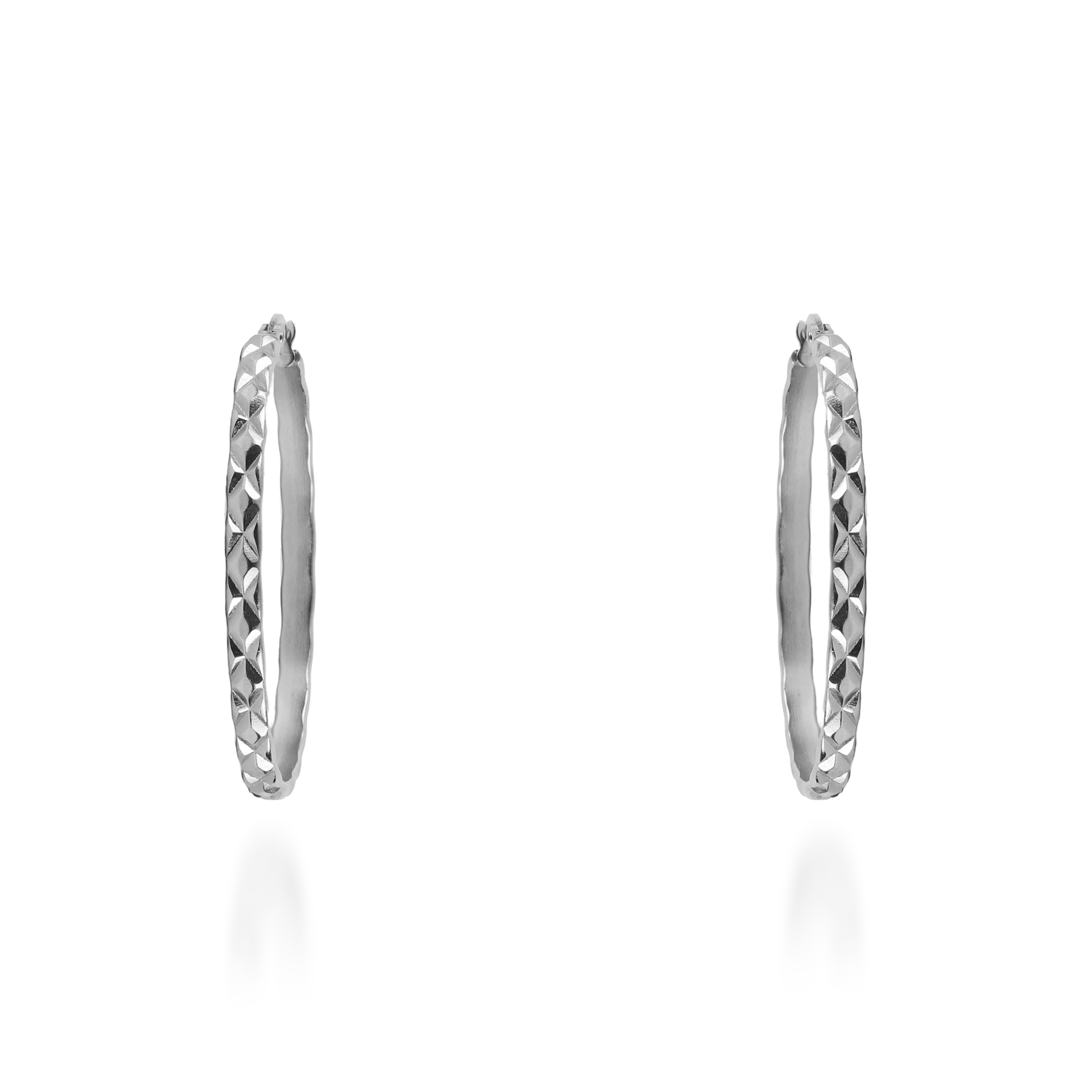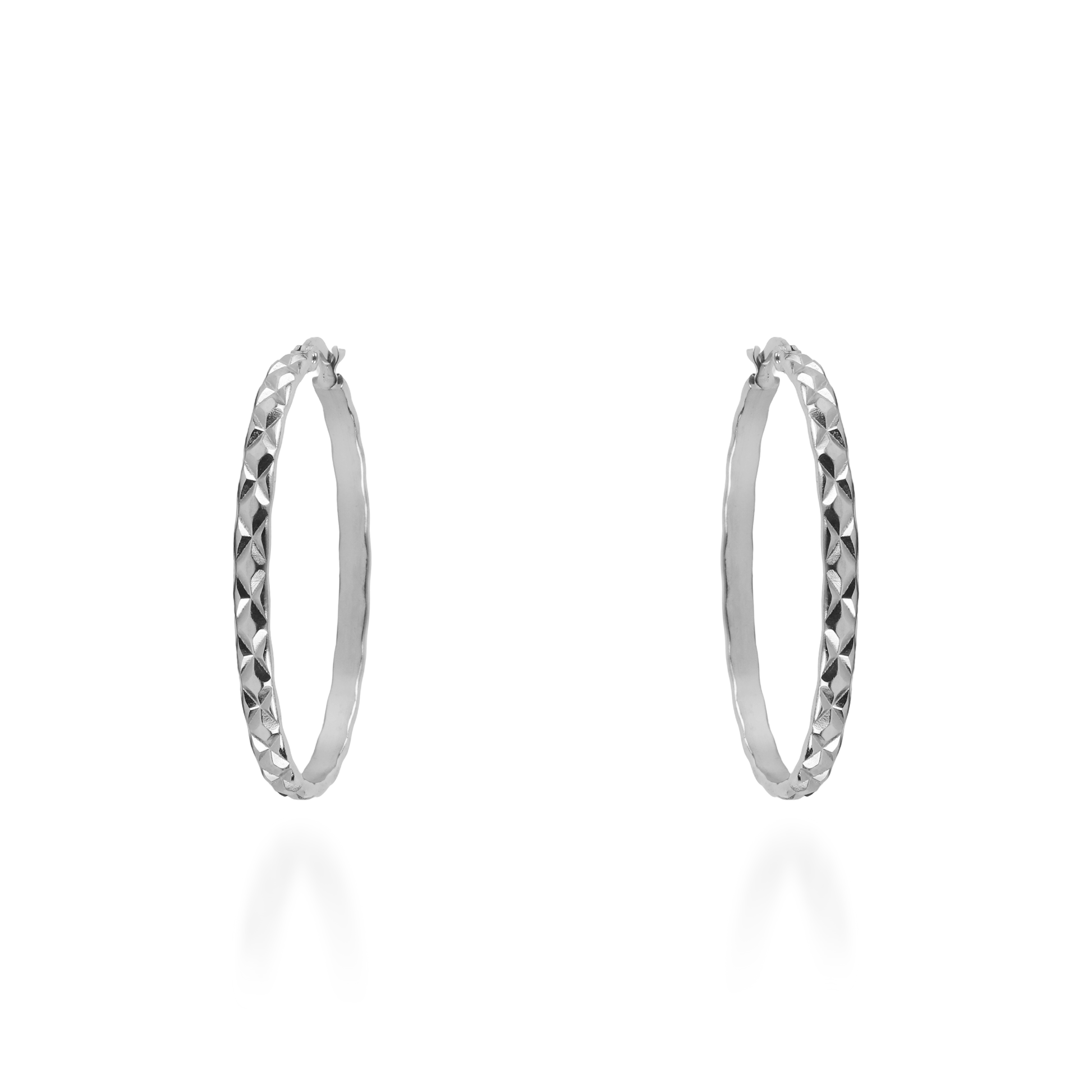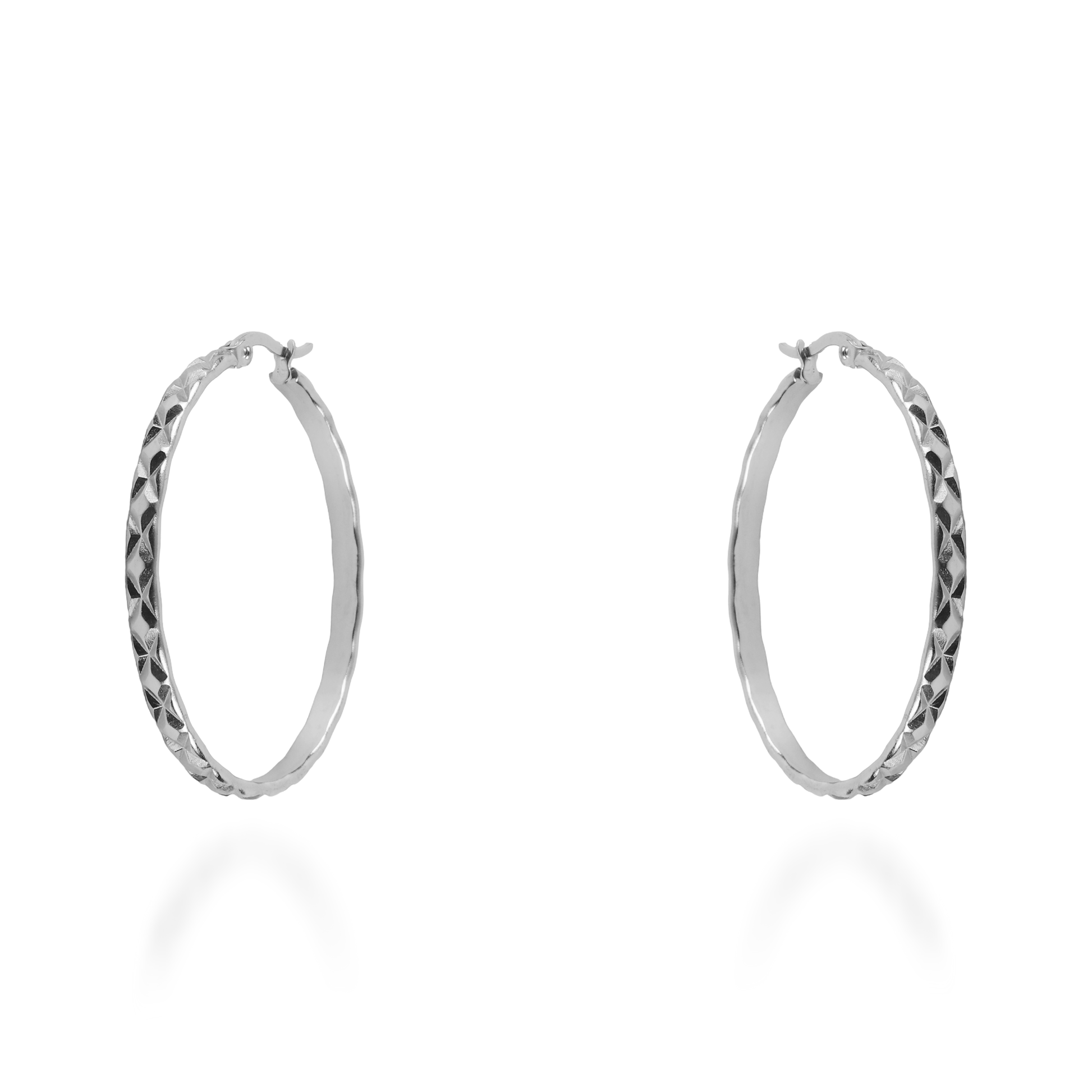 Σκουλαρίκια κρίκοι από ανοξείδωτο ατσάλι με ανάγλυφο σχέδιο με τρίγωνα που δημιουργούν ένα μοναδικό και διακριτικό στυλ. Το ανάγλυφο σχέδιο με τρίγωνα προσδίδει έναν ενδιαφέροντα χαρακτήρα στα σκουλαρίκια, δίνοντάς τους έναν μοντέρνο αέρα. Είναι ιδανικό κόσμημα που μπορεί να φορεθεί εύκολα και να προσθέσει στυλ σε κάθε εμφάνιση.