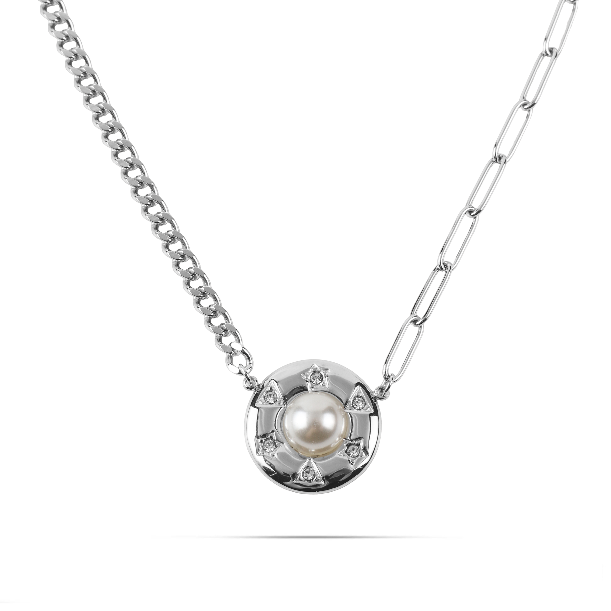 Κολιέ από ανοξείδωτο ατσάλι με όμορφο μενταγιόν που διακοσμείται με μια λαμπερή λευκή πέρλα και πέτρες Ζircon. Η αλυσίδα από ανοξείδωτο ατσάλι προσθέτει μια μοντέρνα αίσθηση, ενώ η πέρλα δίνει μια κομψή πινελιά. Αυτό το κολιέ είναι κατάλληλο για κάθε περίσταση, από τις καθημερινές εμφανίσεις έως τις ειδικές περιστάσεις, προσφέροντας έναν λαμπερό τρόπο να ολοκληρώσετε το ντύσιμό σας. Επίσης αποτελεί μια εξαιρετική επιλογή για δώρο.