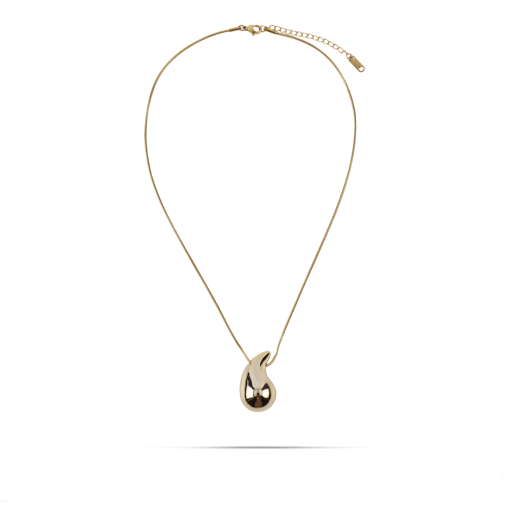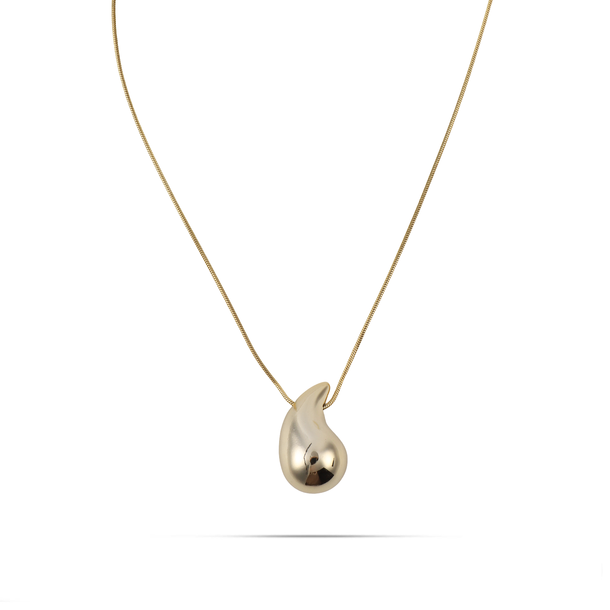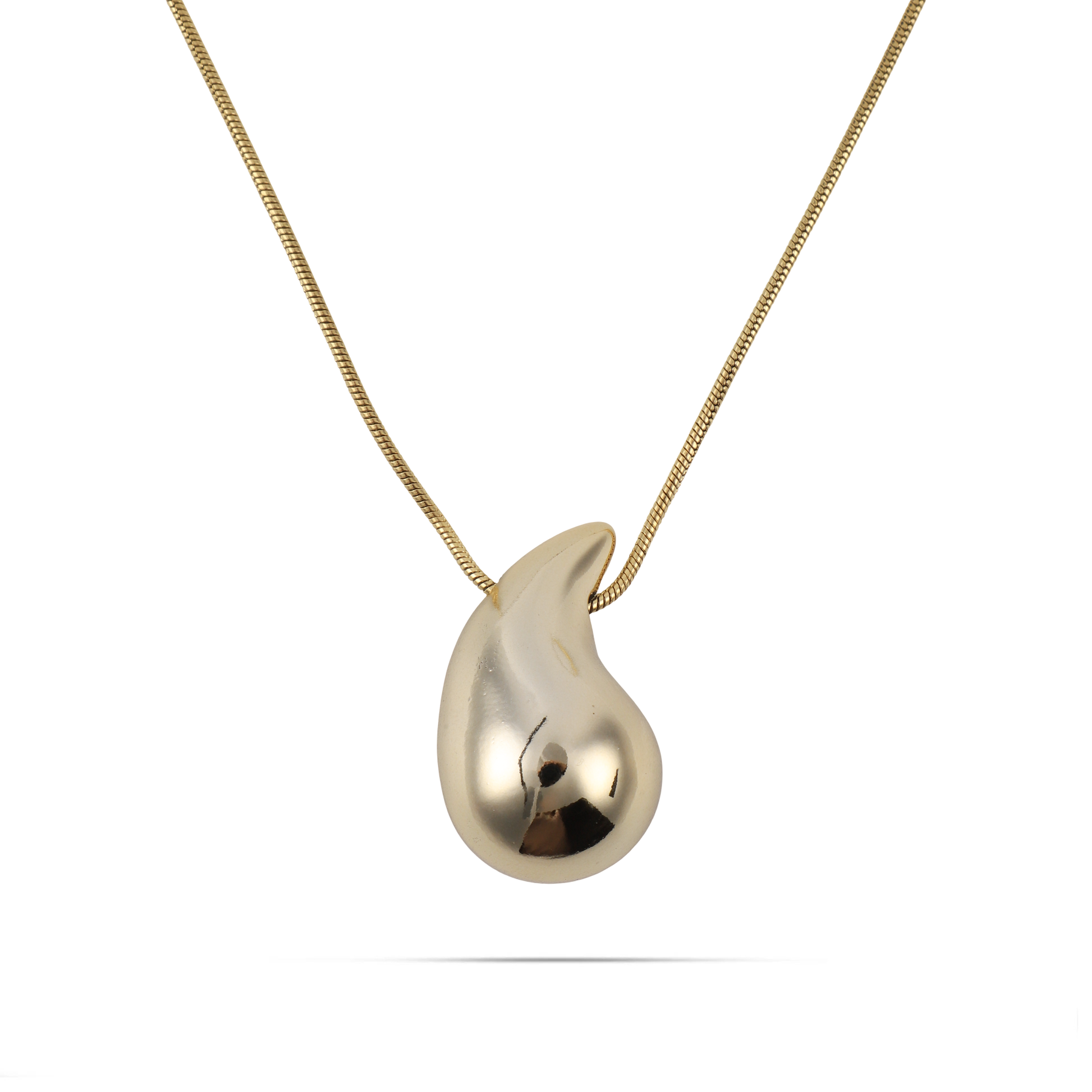 Κολιέ από ανοξείδωτο ατσάλι σε χρυσό χρώμα με μενταγιόν σχεδιασμένο σε σχήμα σταγόνας νερού, που προσφέρει έναν διακριτικό σχεδιασμό. Η επιλογή του ανοξείδωτου ατσαλιού εξασφαλίζει αντοχή στο χρόνο, ενώ το σχέδιο του μενταγιόν προσδίδει ένα κομψό στυλ στο κόσμημα. Είναι ιδανικό για καθημερινές εμφανίσεις καθώς και για ειδικές περιστάσεις.