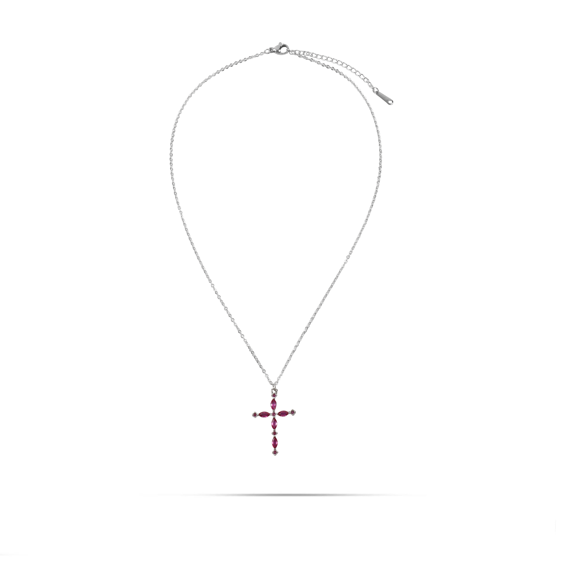 Κολιέ σταυρός με πέτρες ζιργκόν Mar and Mar Ruby (Magenta) από ανοξείδωτο ατσάλι