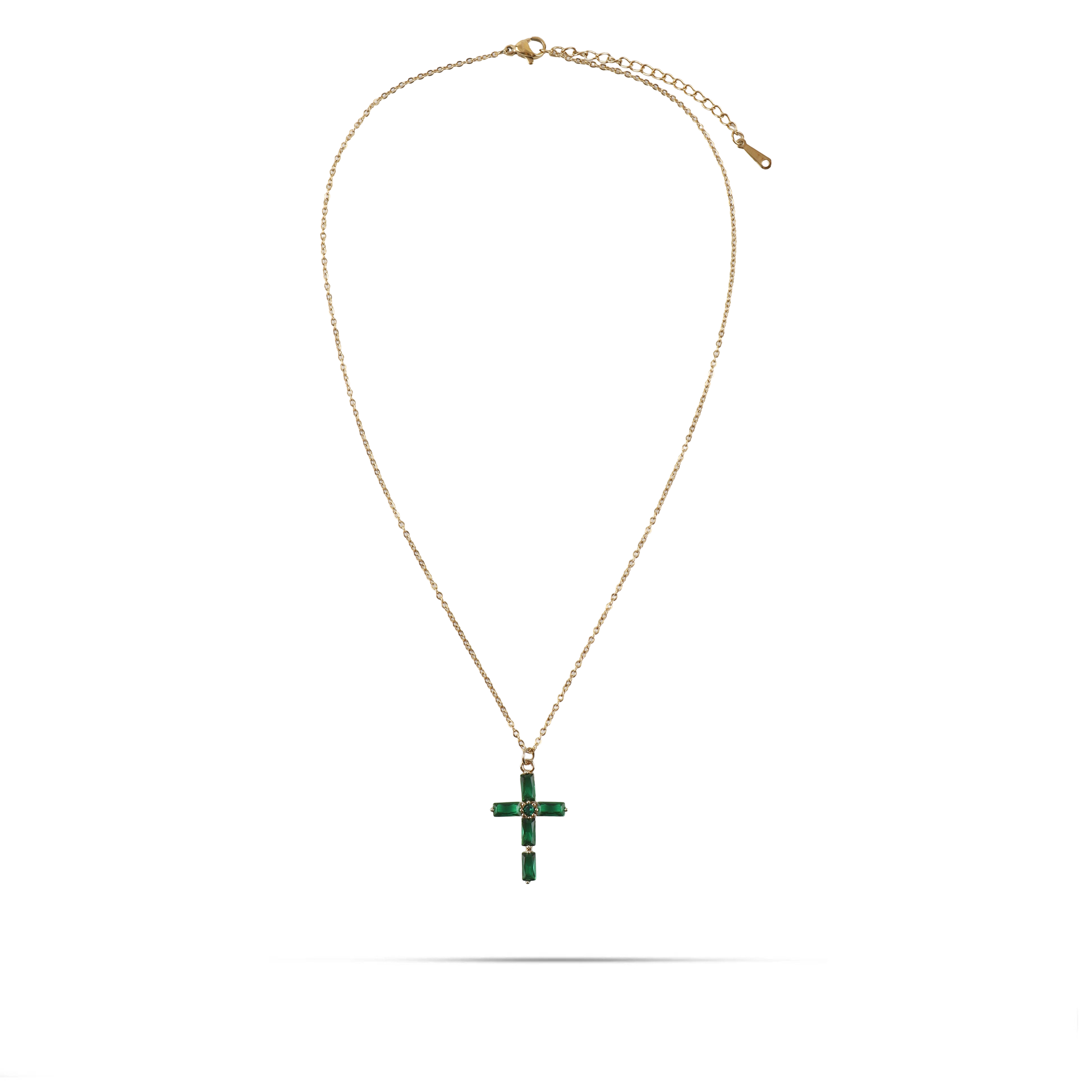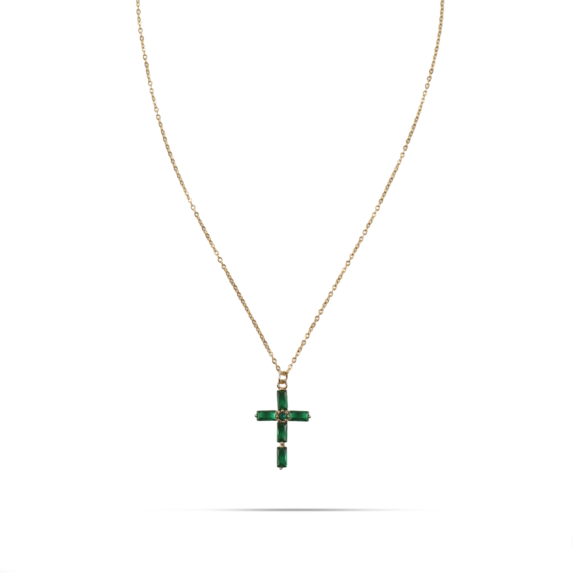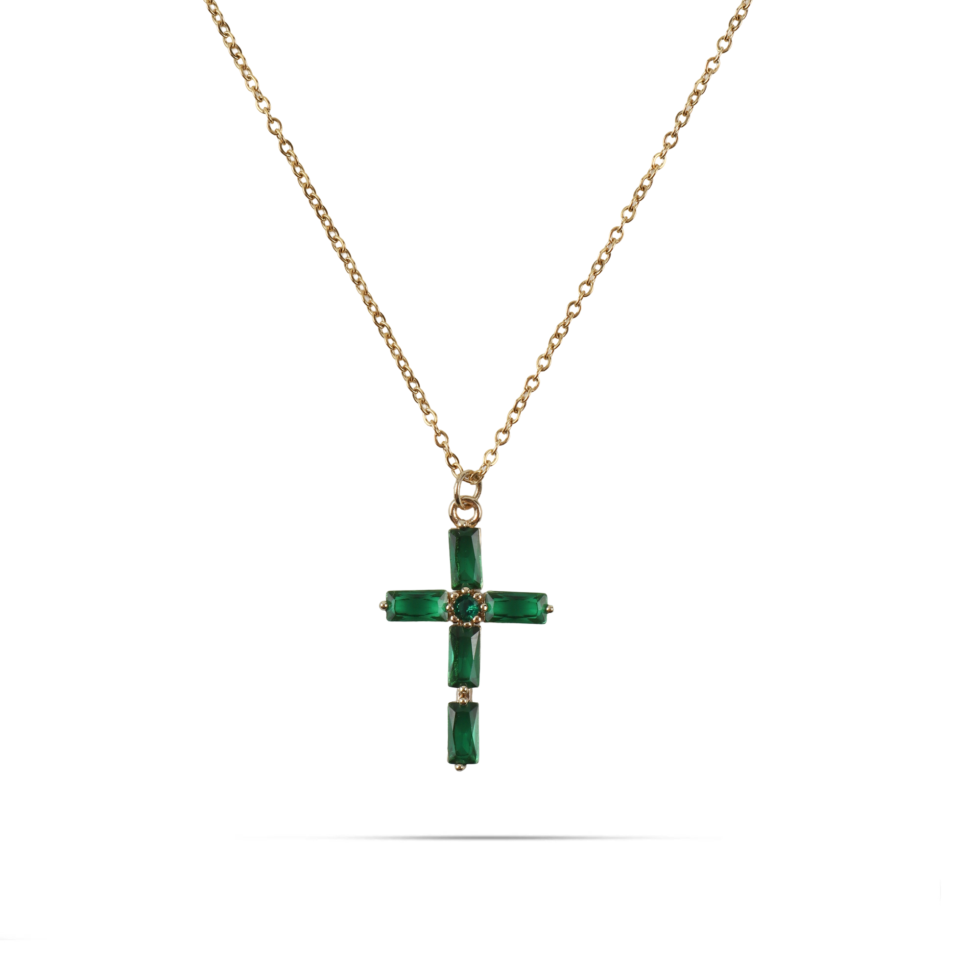 Κολιέ σταυρός από ανοξείδωτο ατσάλι σε χρυσό χρώμα που είναι διακοσμημένος με πέτρες Baguette Zircon. Οι πέτρες Baguette Zircon προσθέτουν λάμψη στον σταυρό, δημιουργώντας ένα εντυπωσιακό σχέδιο. Το ανοξείδωτο ατσάλι προσδίδει αντοχή και ανθεκτικότητα στο κολιέ, καθιστώντας το ιδανική επιλογή για καθημερινή χρήση. Αυτό το κολιέ είναι ένα κομψό κόσμημα που μπορεί να φορεθεί με στυλ σε διάφορες περιστάσεις.