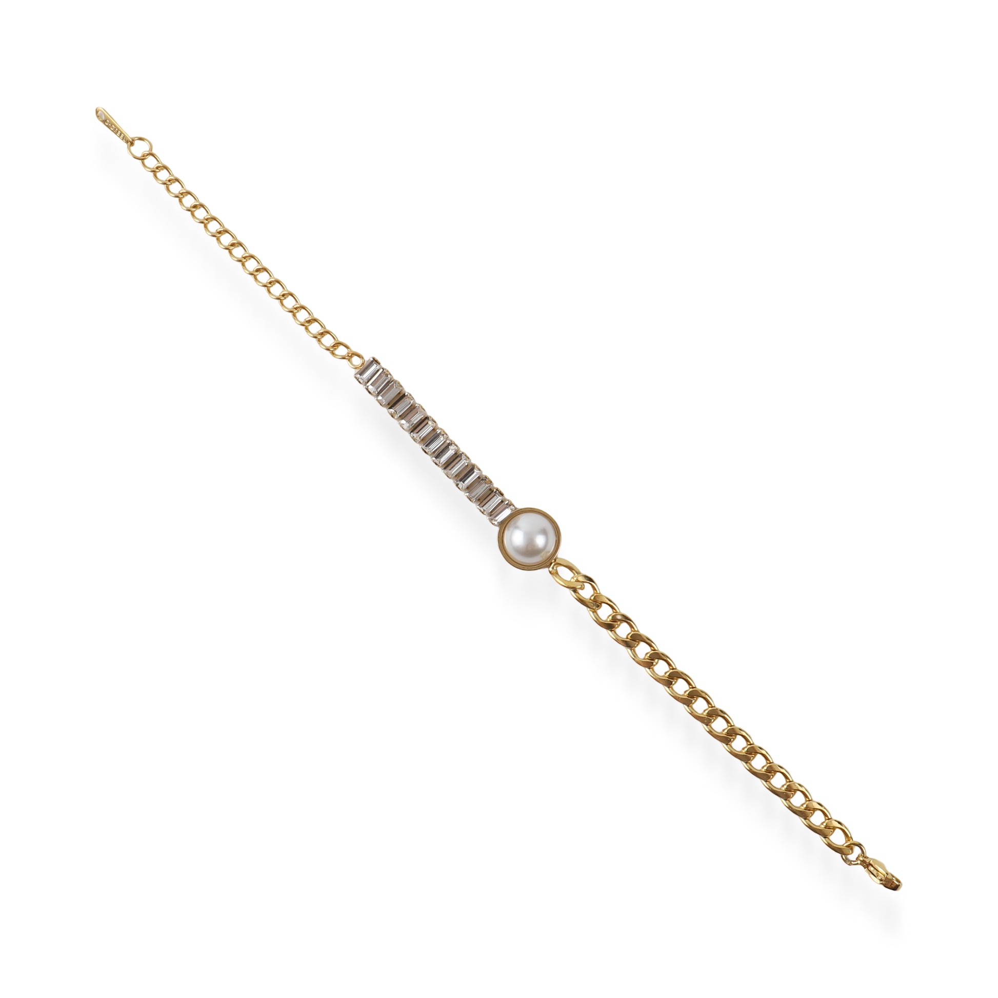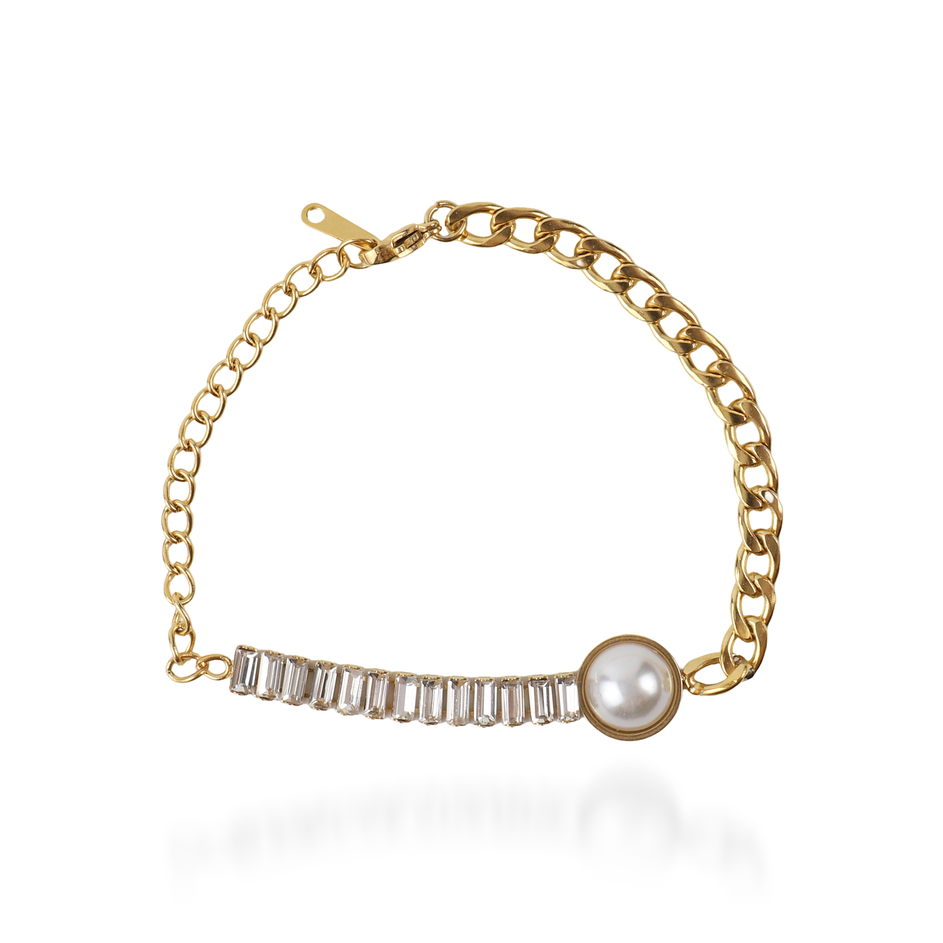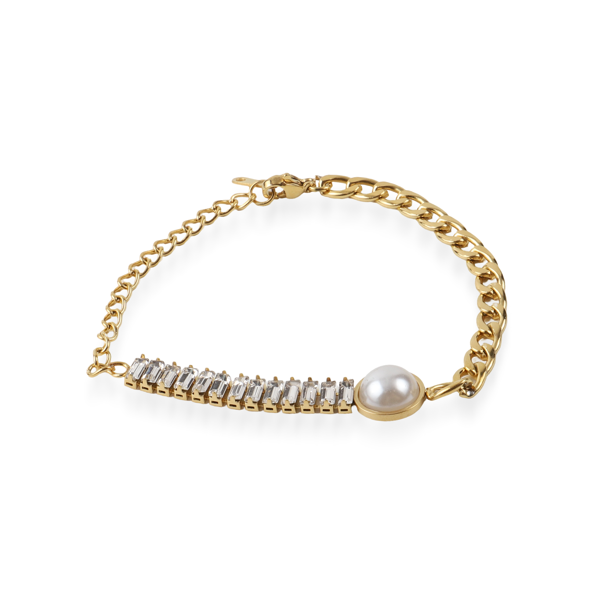 Αναβαθμίστε το στυλ σας με αυτό το κομψό βραχιόλι-αλυσίδα από ανοξείδωτο ατσάλι σε χρυσή απόχρωση. Διακοσμημένο με λαμπερές λευκές πέτρες και μια εντυπωσιακή πέρλα, αποπνέει διαχρονική φινέτσα και κομψότητα. Ιδανικό για να ολοκληρώσετε τις εμφανίσεις σας με έναν διακριτικό αλλά πολυτελή τόνο, ενώ η ανθεκτική του κατασκευή υπόσχεται λάμψη που διαρκεί στον χρόνο.